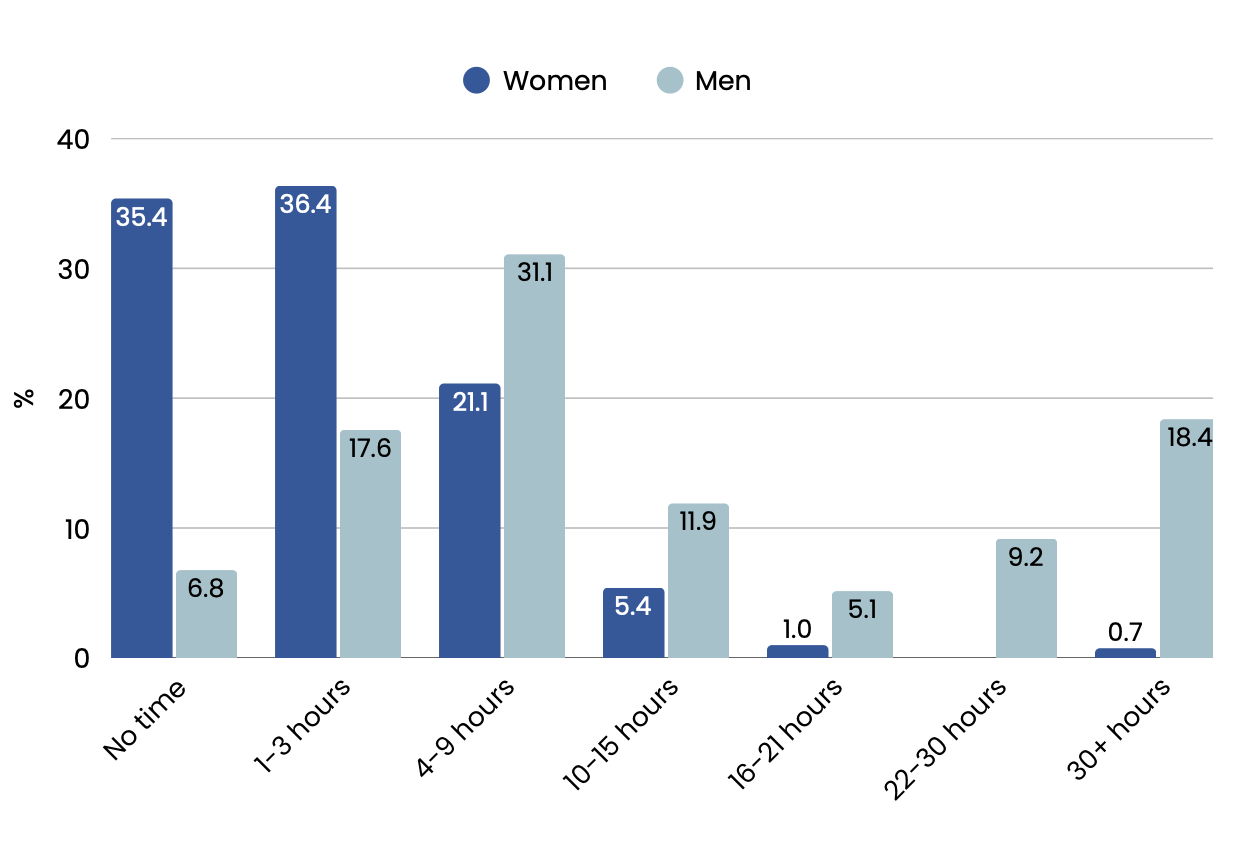 Figure 2 shows the number of hours participants spend on housework per week by gender. The majority of female participants reported spending more than 4 hours per week on housework, while the percentage of men doing so was significantly low. Approximately 17.2% of women stated that they do more than 30 hours of housework per week, 19.2% do 10–15 hours, and 17.2% do 16-30 hours. In contrast, approximately 36.8% of men stated that they do 1–3 hours and 38.4% stated that they do no housework at all. These findings show that domestic labor is distributed unequally between men and women, with most of the burden falling on women.