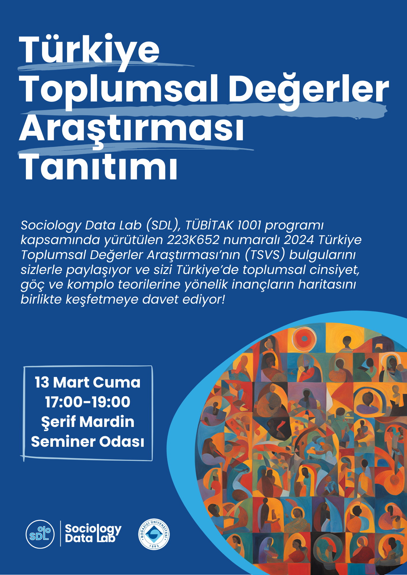 The Sociology Data Lab (SDL) is sharing the findings of the 2024 Turkey Social Values Survey (TSVS) (Project no: 223K652), conducted under the TÜBİTAK 1001 program, and invites you to explore beliefs regarding gender, migration and conspiracy theories in Turkey!