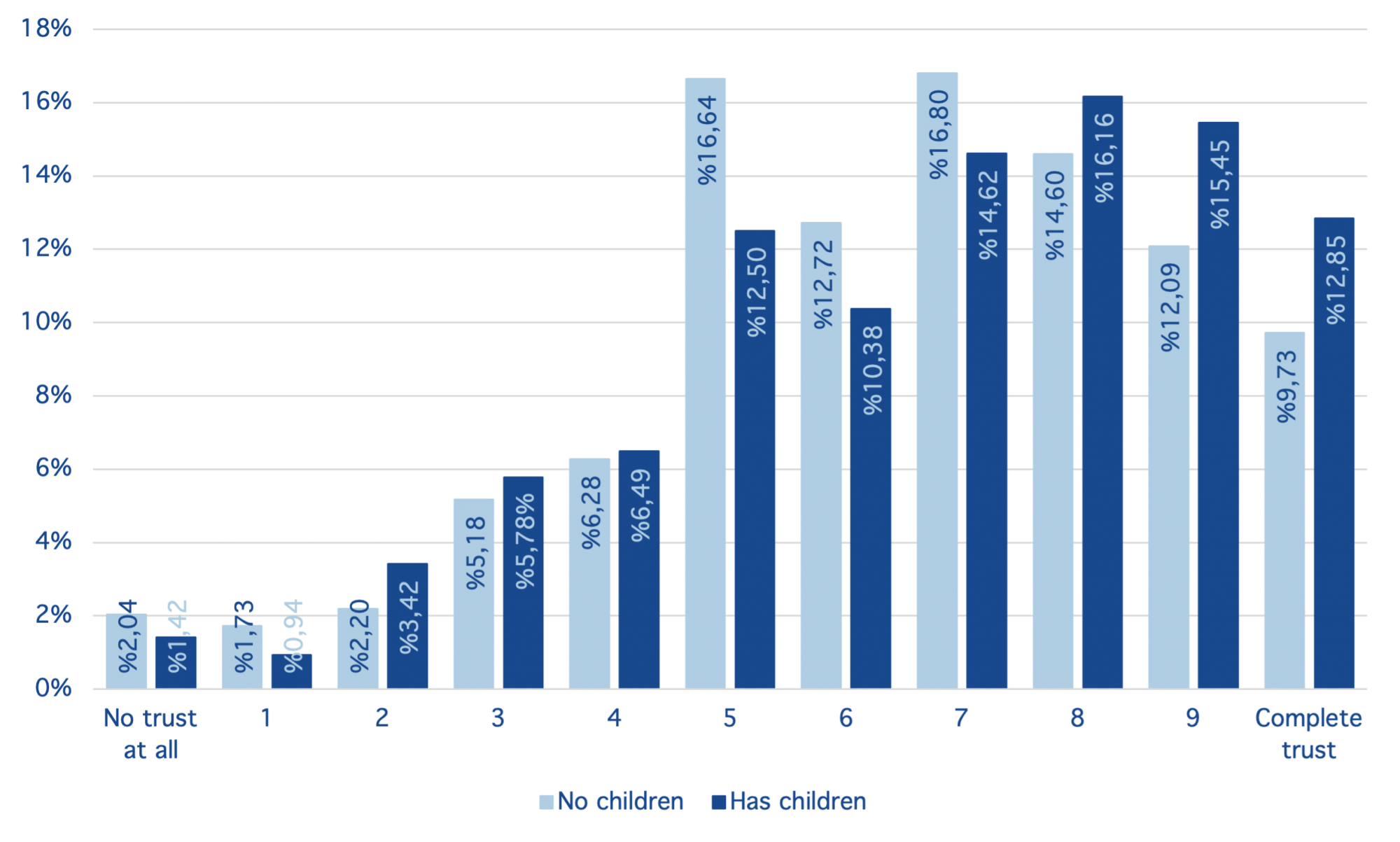 Comparing individuals who have children (56.87% of the sample) to those without children (43.13% of the sample), we find that those with children have significantly greater levels of trust in childhood vaccinations. For instance, 12.85 percent of those who have children completely trust childhood vaccines compared to 9.73 percent of those without children. On the other hand, around 30 percent of individuals with children report a trust level of 5 or less compared to 34 percent of those without children (See Figure 3).