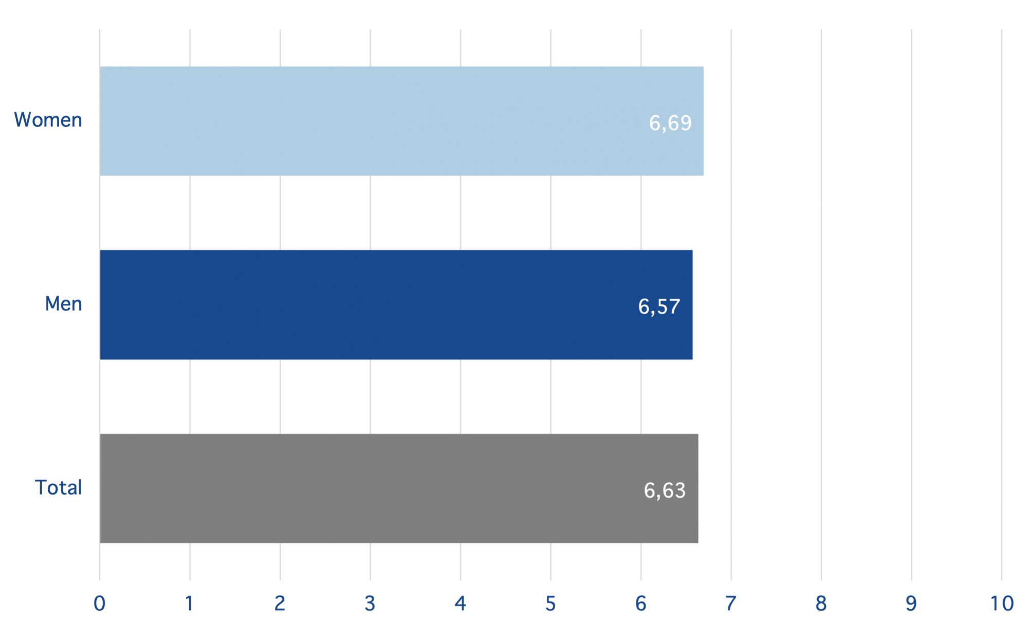 Examining the variation in trust in childhood vaccines by gender, no significant difference was found between the trust levels of men and women. On a scale from 0 to 10, women’s trust in childhood vaccinations was 6.69 compared to men’s trust level of 6.57 (See Figure 2). We also did not find age to be a significant determinant of trust in childhood vaccinations.