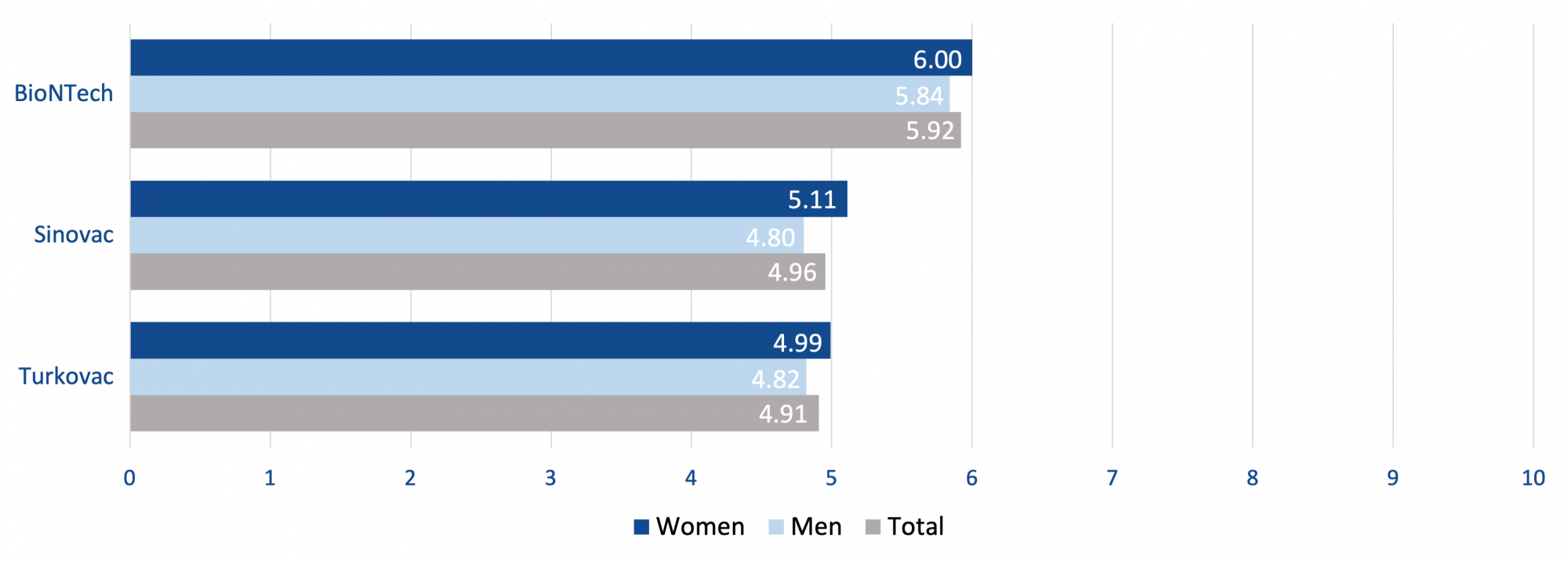 Using Turkish COVID-19 Values Survey (TCVS), we examine the level of trust in BioNTech, Sinovac and Turkovac COVID-19 vaccines in Turkey and demonstrate how level of trust in vaccine brands differ by age and gender. TCVS was conducted face to face with 1500 participants in 2022. In the survey, the trust levels of the respondents for the COVID-19 vaccine brands (BioNTech, Sinovac, and Turkovac) were measured using a 11-point scale.