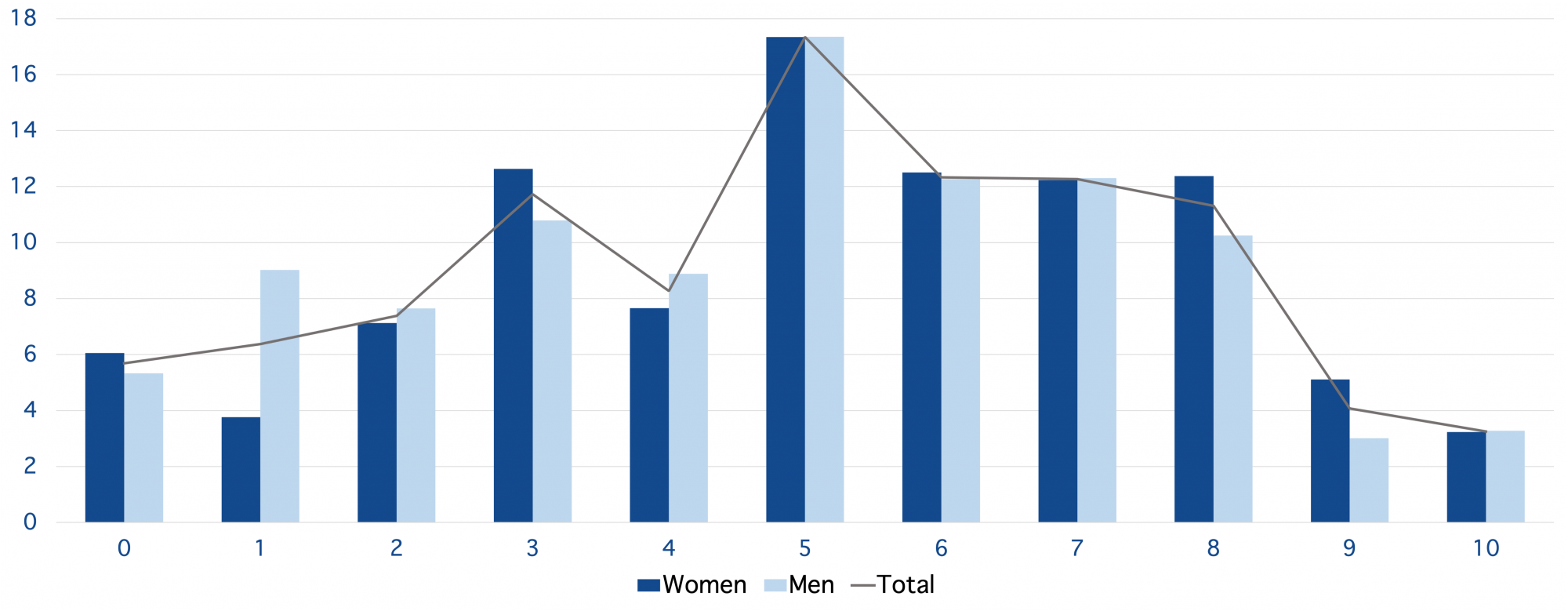 The percentage of men placing themselves between the points from 0 to 4, thus reporting distrust towards the BioNTech vaccine, is slightly higher than the percentage of women (13.4% to 11.5%) (see Figure 2). Overall, on a scale from 0 to 10, The mean level of trust for the BioNTech vaccine is 5.91 (see Figure 1). Trust in the Biontech vaccine do not significantly differ by age or gender.